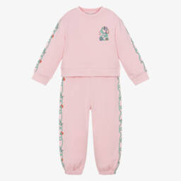 Mini-me green tracksuit for boys by EA7 Emporio Armani, made in soft cotton jersey. It features a bold colourblock pattern on the sleeves and back of the joggers for a cool, sporty look. The zip-up top has front pockets and a logo printed on the chest. The joggers have matching pockets and logo details with an internal drawstring on waistband.