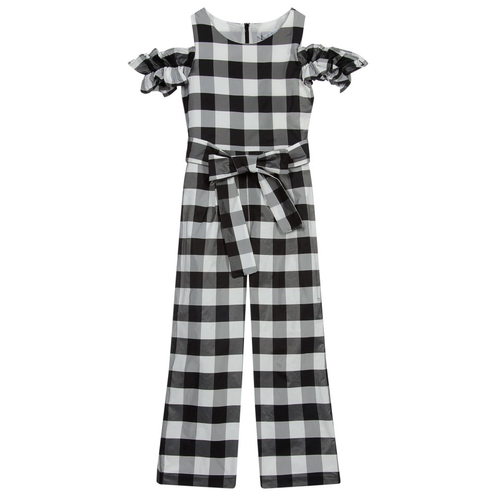 Black and white checked jumpsuit for girls by Elsy, made in lightweight polyester satin. It has pretty, off-the-shoulder, ruched sleeves and a detachable sash tie. The bodice has a soft mesh lining and the jumpsuit fastens with a zip on the back.