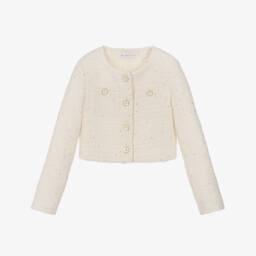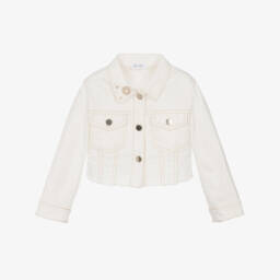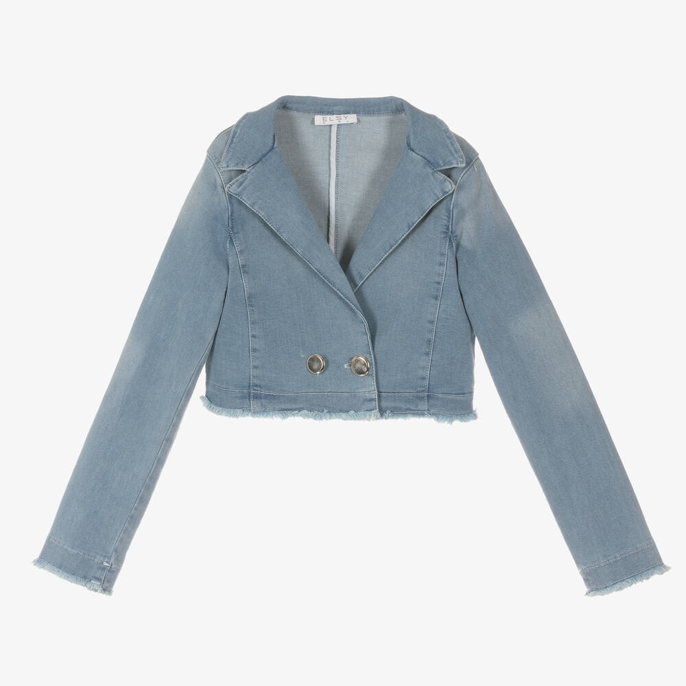 Light blue denim jacket for girls by Elsy, in a cropped length. Frayed at the hem for added style, this lightweight layering piece has a little stretch and cool exposed stitching. It fastens with shiny silver buttons on the front for a chic finishing touch.