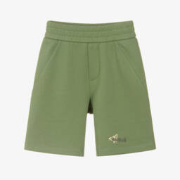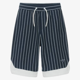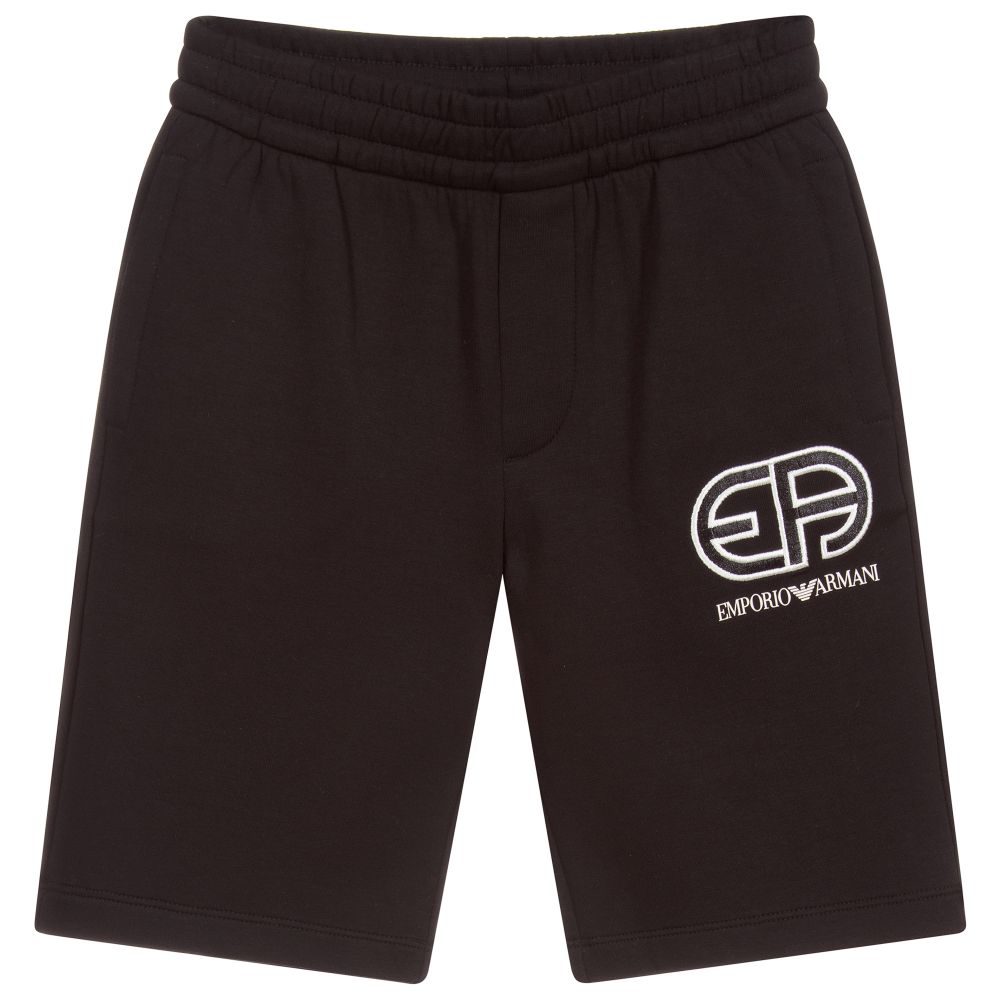 Boys casual shorts in black by Emporio Armani. Made in super soft and comfortable cotton jersey in an oversized fit, they have a navy blue and ivory embroidered EA logo on one leg. The elasticated waistband has an adjustable inner drawstring.