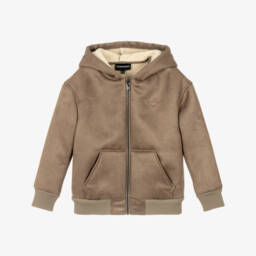 Стильная и практичная бежевая куртка для мальчиков от роскошного итальянского бренда Emporio Armani. Выполнена с шелковистым покрытием и внутренней отделкой с логотипом. Имеет проклеенные швы и застежку на молнии. Надежные карманы на молнии и кремовая нашивка с логотипом бренда на рукаве.