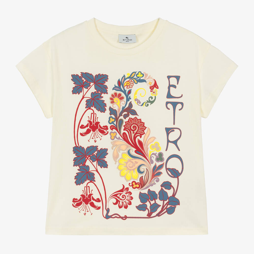 Girls ivory T-shirt by luxury Italian brand Etro, made in soft cotton jersey for relaxed, casual wear. Instantly recognisable, this short-sleeved tee features the designer's name on the front, incorporated into a colourful blue and red paisley print with bright yellow accents.