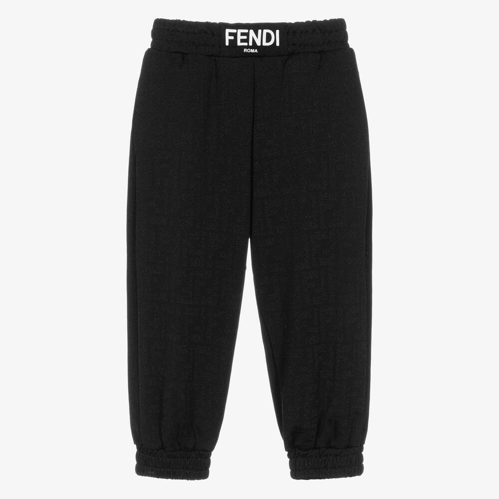 Black joggers for boys and girls by Italian fashion house Fendi, made from soft and stretchy jersey. A bold rubberised logo is featured on the elasticated waist, with a shimmery FF logo interwoven all-over for distinctive designer styling. They are comfortably finished with side seam pockets.