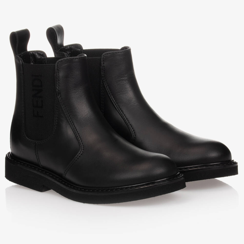 Boys black leather Chelsea boots by luxury brand Fendi. Soft and suppler, they have black velvet logo print on the outer elasticated side panels. They are lined in soft leather and have a sturdy rubber outsole.
