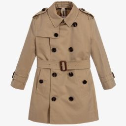 Beige hooded coat for girls and boys by Foque. Warm and comfortable, it is made in a beautifully soft wool and acrylic blend knit. It has wooden button fastenings on the front and a super soft, beige fur trim on the cute pointed hood.