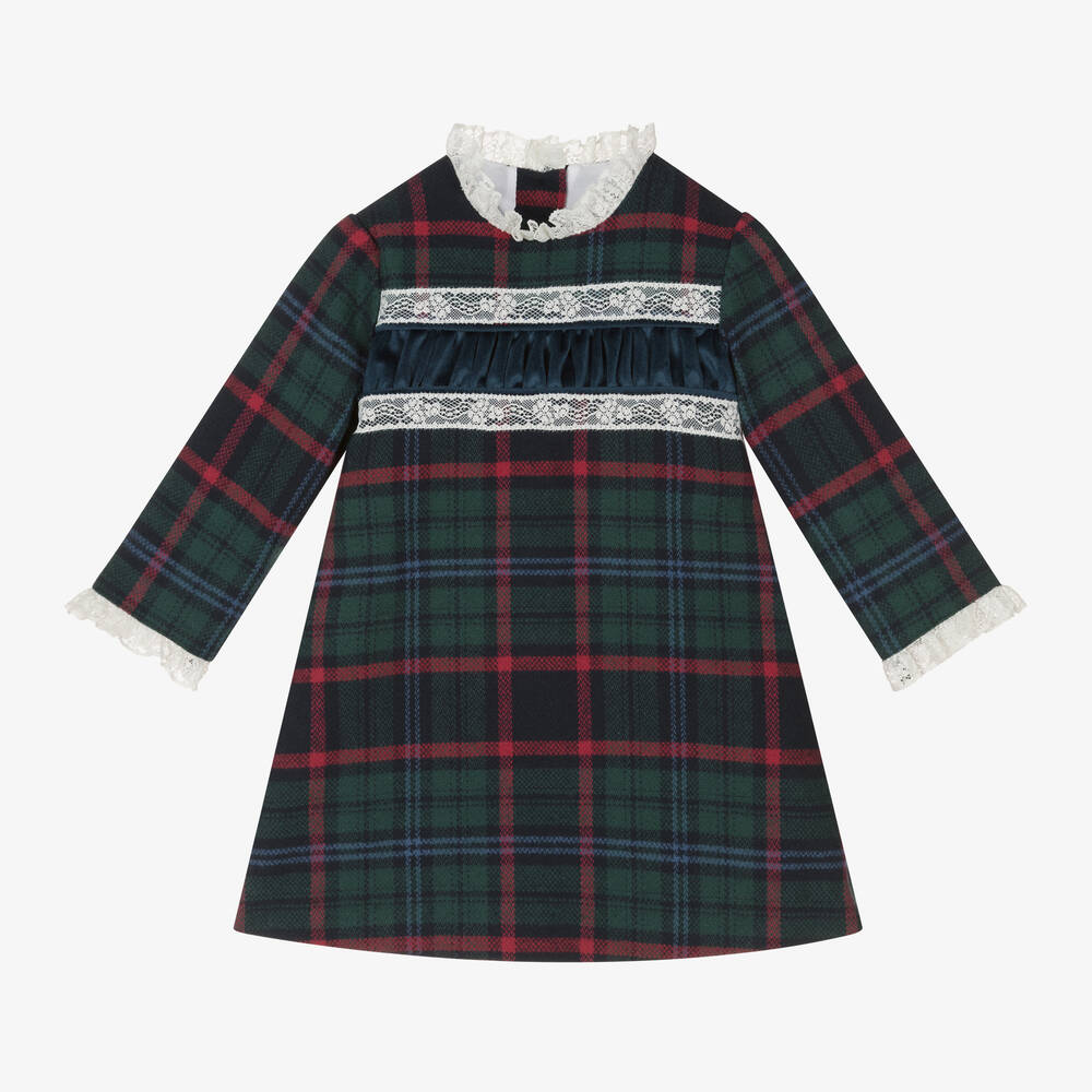 Gorgeous dark green, navy blue and red tartan check dress for girls by Spanish brand, Foque. It has a ruched navy blue velvet panel across the chest and delicate ivory lace trims. This long-sleeved A-line dress is made in a cosy cotton blend weave with a soft brushed finish. It has a lightweight lining for comfort and classic button fastenings along the back.