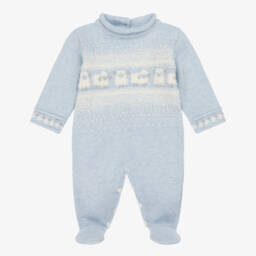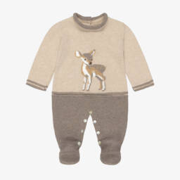 Adorable pale green babygrow for boys and girls by Foque, knitted with a touch of alpaca wool for added warmth and softness. This long-sleeved babysuit has a sweet ivory curled neckline, a tiny branded tab and a cute motif of a brown teddy bear and white bunny on the front. For a classic finish, there are mother-of-pearl button fastenings on the back and along the legs.