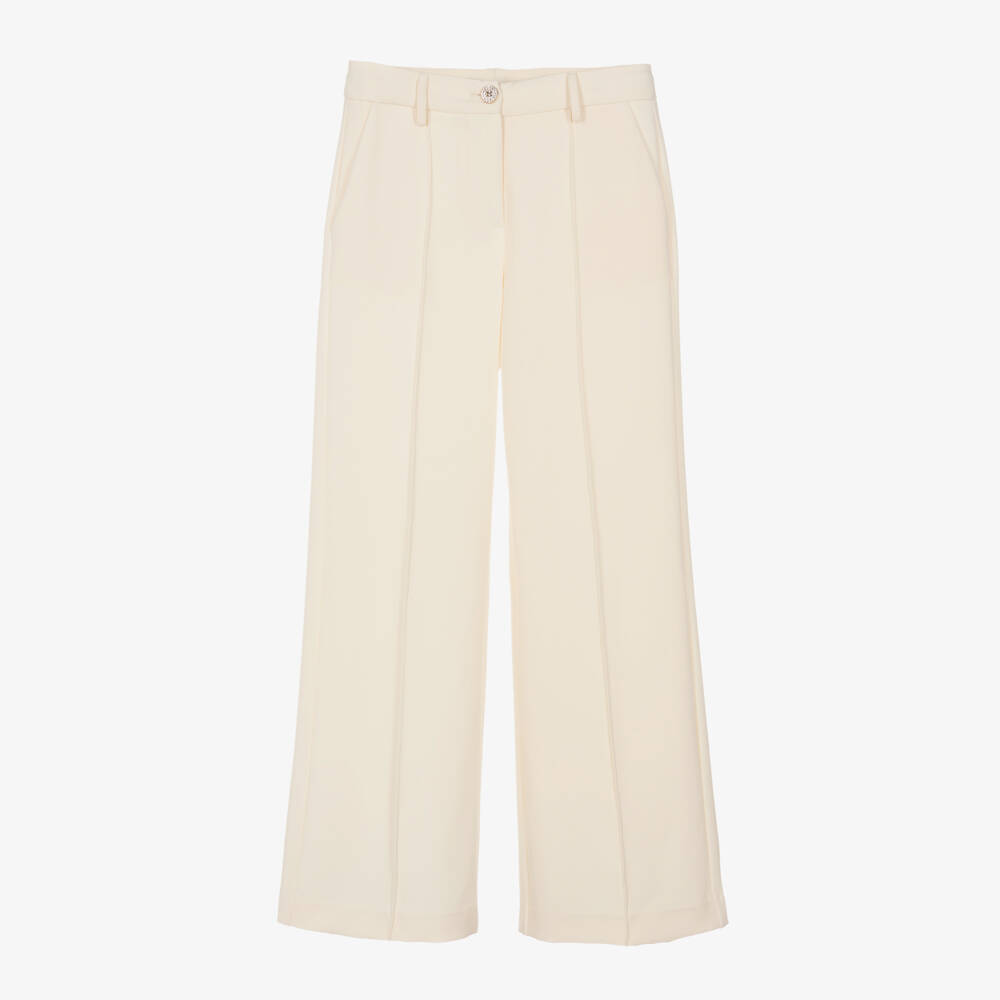 Элегантные кремовые брюки для девочек постарше от Fun & Fun из мягкой ткани креп с добавлением эластана. Эти брюки с широкими штанинами имеют регулируемый пояс с пуговицей с кристаллами и скрытую застежку-молнию. Скошенные боковые карманы и защипы на штанинах придают стильный вид.