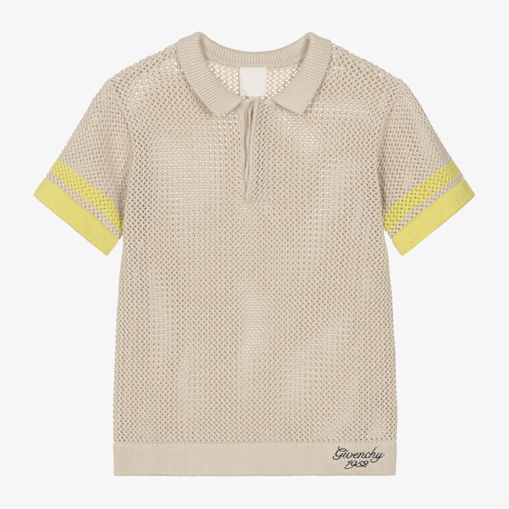 Inspired by the adult collection, a beige polo shirt for boys by luxury label, Givenchy. It is beautifully knitted in an open, lacy design for breathable comfort and an effortlessly cool look. It has short sleeves with vibrant yellow striped trims, a ribbed collar and neatly hidden button fastenings. Adding a designer finish touch, a navy blue Givenchy 1952 signature logo is embroidered on the front hem.