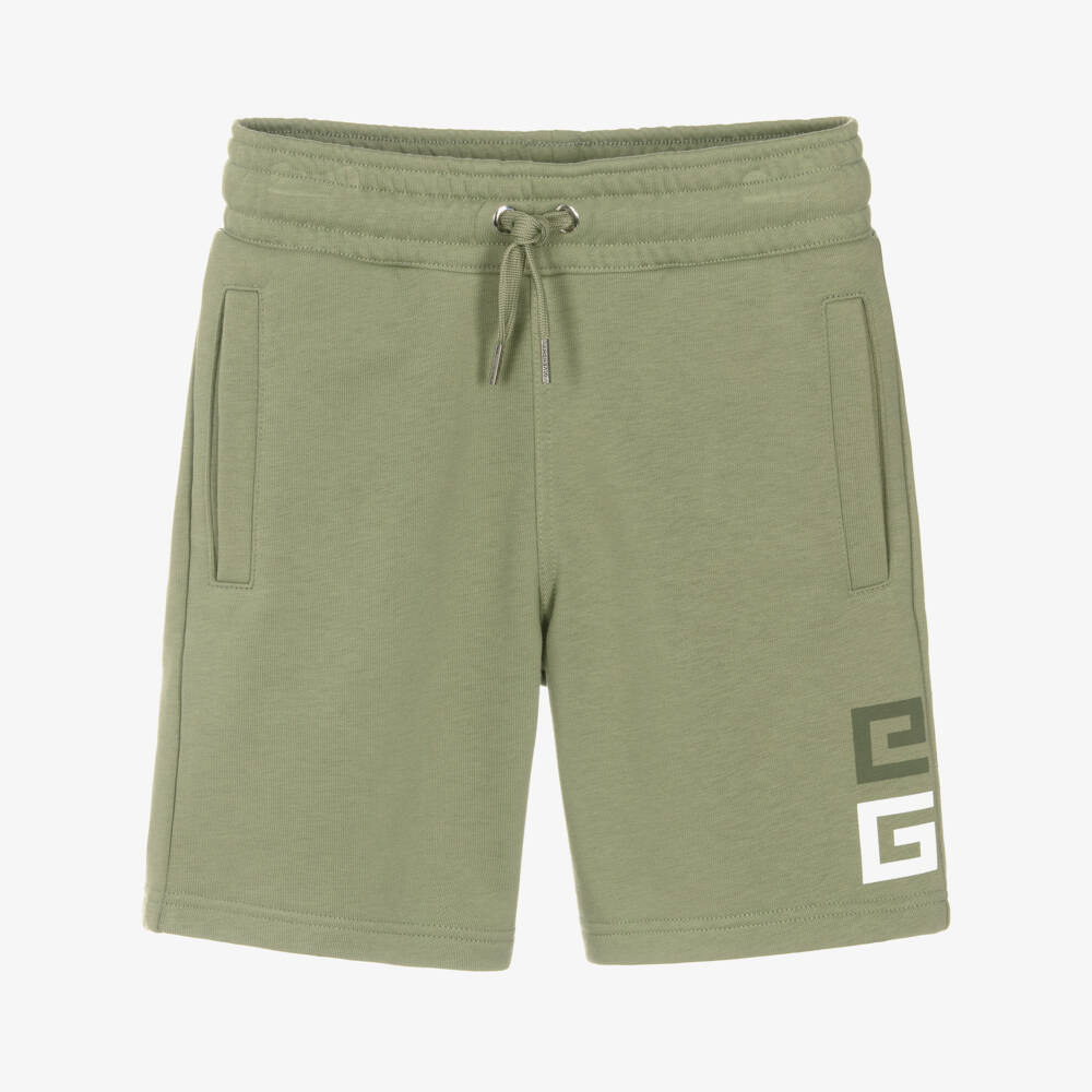 From Givenchy, a pair of green cotton shorts for boys with the instantly recognisable 4G logo on one leg and a logo print on the back. Easy to wear, these soft jersey shorts have an elasticated waist with an adjustable drawstring fastening and useful pockets.