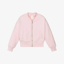 A lovely light pink hooded zip-up for little girls by luxury brand Givenchy. Made with super soft, mid-weight cotton blend jersey, it has a pretty ruffle trim over the ribbed hemline. A glittery silver branding across the front and the iconic 4G logo on the back add a luxury touch to this casual layer.