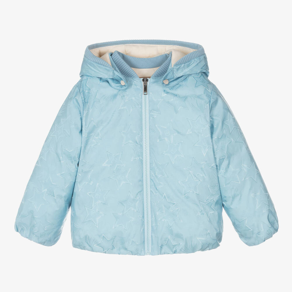 Pale blue puffer jacket for little boys and girls from luxury Italian designer Gucci, with a water-resistant coating. Made in silky jacquard with a lovely star and Double G logo pattern, it is warmly padded with soft down and has a comfortable cotton jersey lining. The removable hood and collar are trimmed with soft wool-blend rib and attach together with poppers. For added cosy wear, the cuffs and hem are gently elasticated and the jacket fastens with a branded zip.