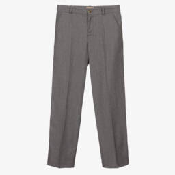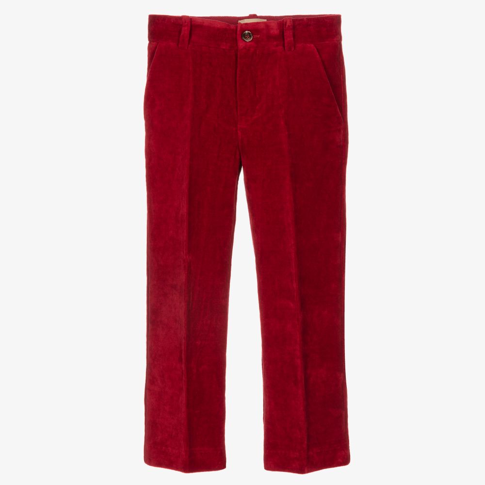 Boys crushed red velvet trousers by luxury brand, Gucci. Forming part of the Ouverture collection, these smart chinos take influence from the 60's and 70's, with a nod to the House's archive designs. They have side pockets and a shiny button and zip fastening on the front. They have a logo tag stitched on the back and an adjustable waist.