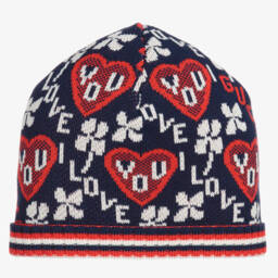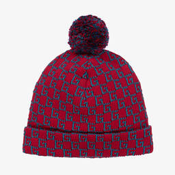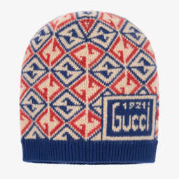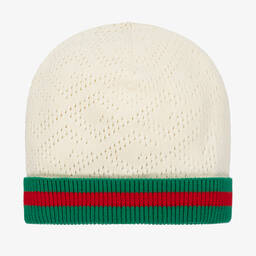 Mini-me brown and beige striped slouch hat for boys and girls by luxury Italian brand Gucci, made in a soft wool knit. It has a brown GG logo pattern and a brown brim.
