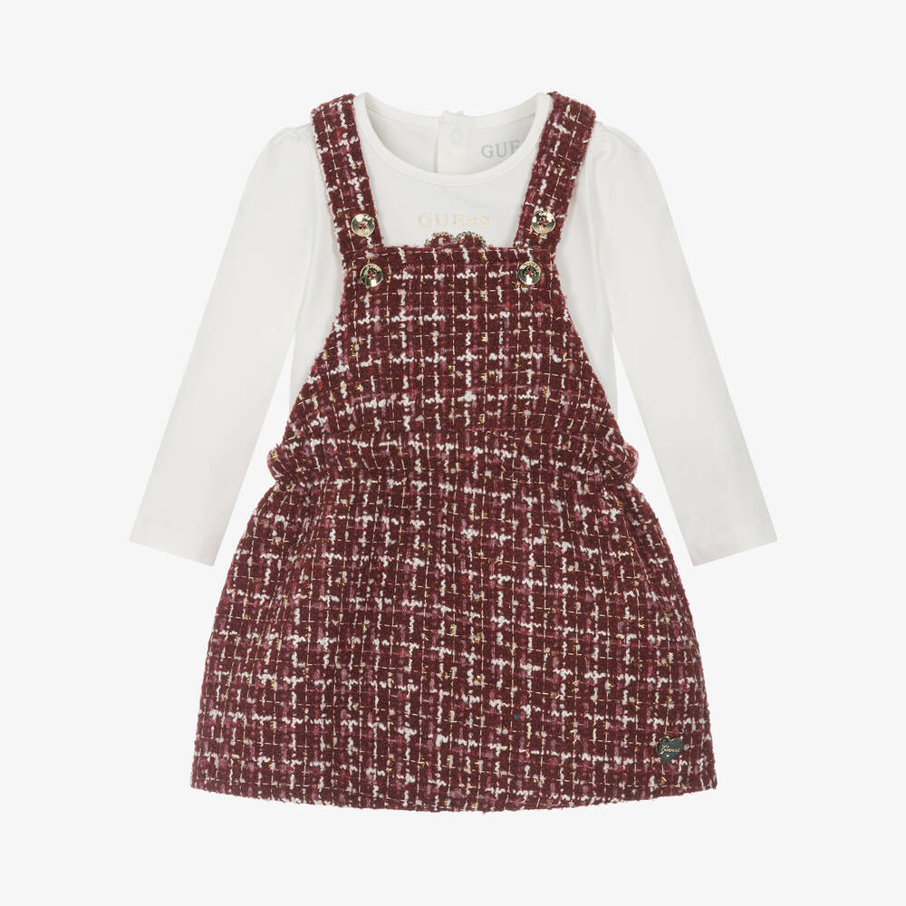 Lovely ivory bodysuit and red tweed dress set for baby girls by Guess. The long-sleeved bodysuit is made in soft and comfortable cotton jersey. Simply styled, it has a heart logo appliqué with sparkly sequins, and fastens with poppers on the back and between the legs. The pinafore dress is made in red and ivory tweed fabric with a subtle gold sparkle and has adjustable shoulder straps with gold-tone branded buttons. A gold-tone heart logo above the front hem adds a discreet branded touch.