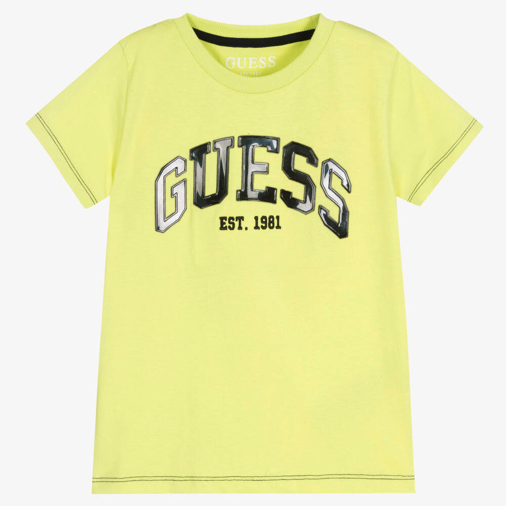 Lime green cotton T-shirt for little boys by American brand Guess, made in comfortable jersey for relaxed days. It has the designer's shiny, rubberised black logo on the front, with black overstitching on the cuffs and hemline. This T-shirt contains in-conversion cotton fibre.