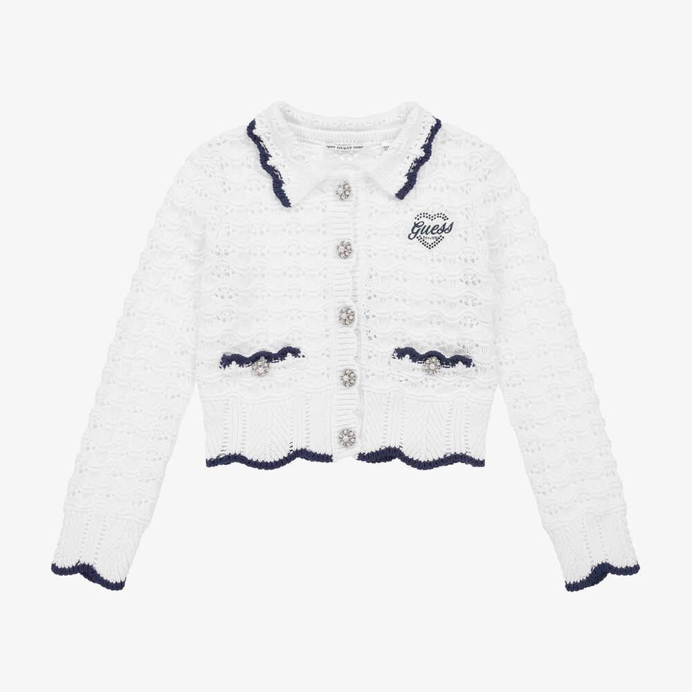 Chic white long-sleeved cardigan for girls by Guess, with a smart collar. Super soft, breathable and patterned with openwork detailing, this cotton crocheted piece is designed with your little one's comfort in mind. It has sparkling faux pearl and diamanté buttons on the front, navy blue scalloped edges, and faux pockets. A diamanté-studded, heart-shaped logo appliqué is stitched on the front for instant brand recognition. This garment contains organic cotton.