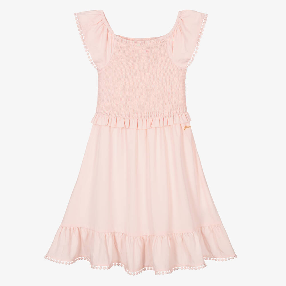 Lovely pale pink dress for junior girls by Guess, made in soft and lightweight viscose. Designed with a shirred elastic bodice and stretchy neckline for easy slip on, it has pretty ruffle trims with delicate embroidered edging.