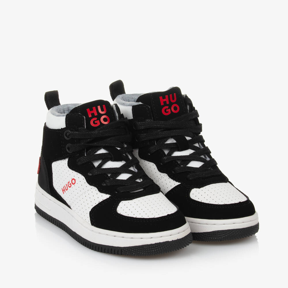 Cool black and white high-top for boys by HUGO, as seen in the adult collection. Perforated for that signature, sporty style, the brand's spell-out logo can be seen accenting the tongue, the sides and the heel in striking red. They are made in supple faux leather and have a soft jersey lining and comfortable, cushioned insole, ideal for maximum comfort. They fasten with black laces on the front and a rubber chunky outer sole in a monochrome stripe.