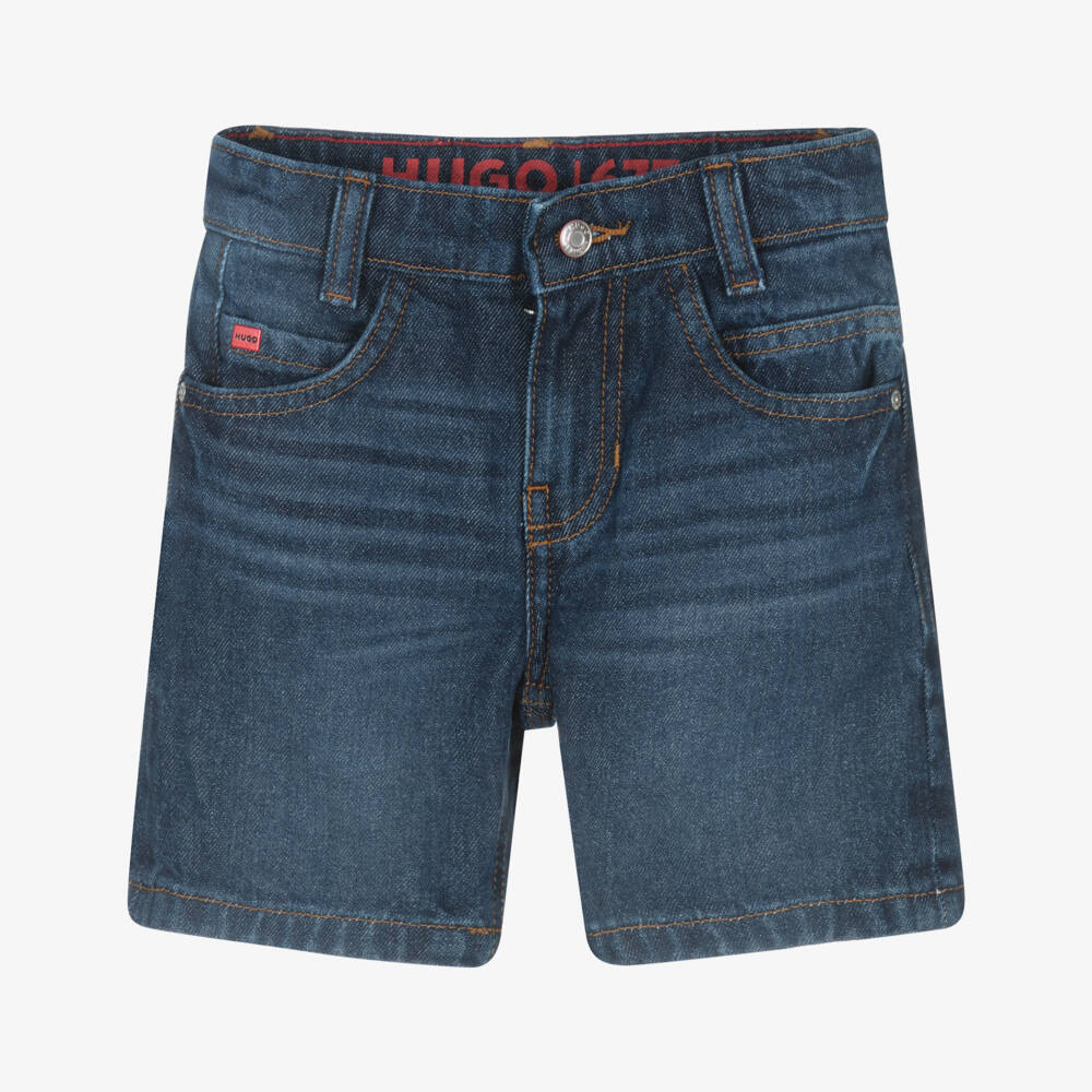 Boys blue denim shorts by HUGO, ideal for pairing with a casual t-shirt and trainers for a relaxed summer look. With a regular fit and a classic five-pocket design, they are made in mid-weight, non-stretch cotton, with subtle, tan overstitch detailing and branded red patches on the front and back to add a touch of style. Smaller sizes have an adjustable waistband for comfort.