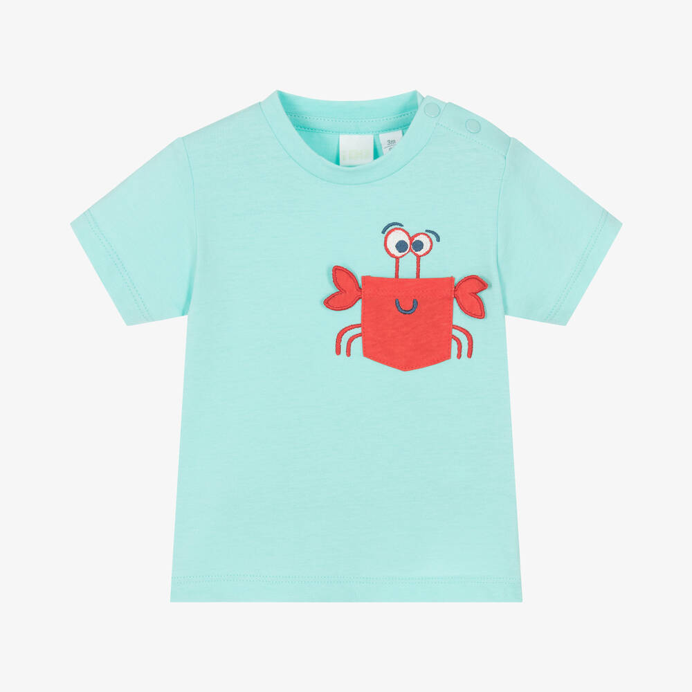 A fun, turquoise blue T-shirt for baby boys by iDO Mini, made in soft cotton jersey. Adding a playful touch to a casual style, it has a bright red chest patch pocket designed as a friendly crab. There are poppers on one shoulder to help with dressing.