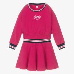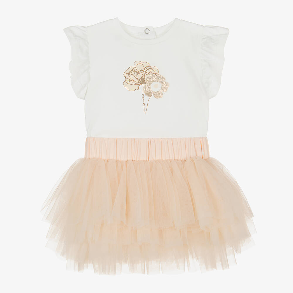 A pretty ivory and pink skort set for baby girls by iDO Mini, fun for casual wear. The cotton jersey T-shirt has a glittery floral print and ruffled short sleeves, fastening on the back with poppers. A voluminous tulle skort with attached jersey knickers finishes this lovely outfit.