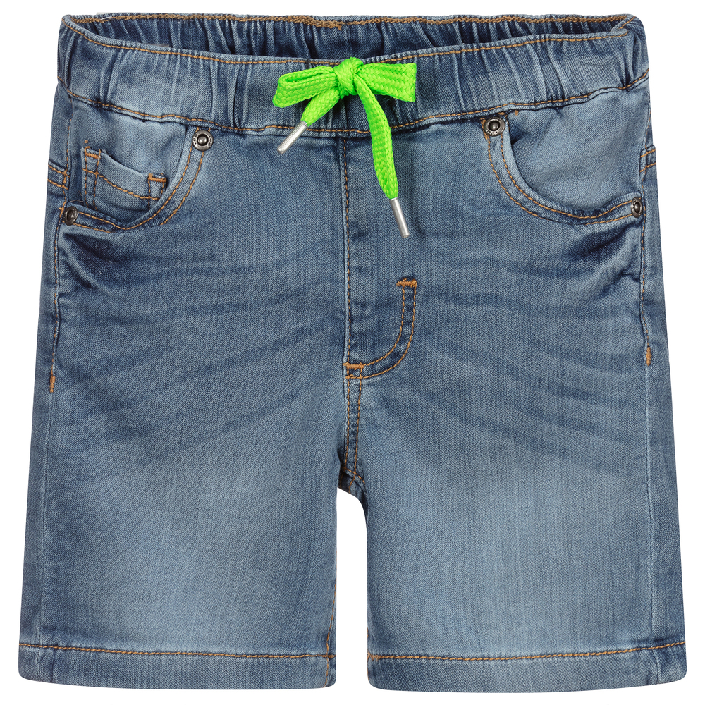 Blue shorts for boys, by iDO Baby. Made in soft, stretchy cotton blend fabric that looks like denim with the comfort of jersey. They have an elasticated waistband, with an adjustable neon green drawstring on the front. There are useful pockets on the front and back.