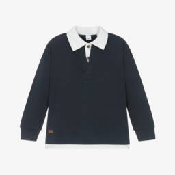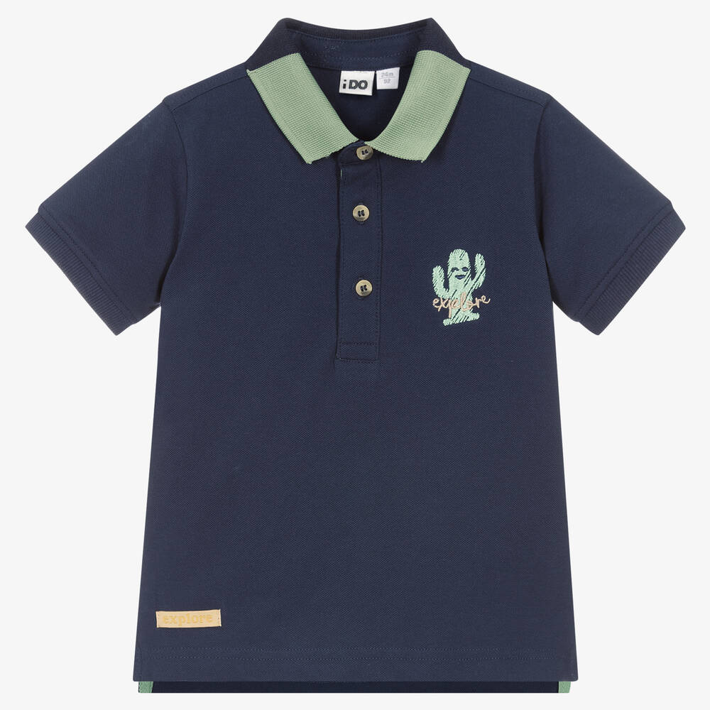 Navy blue with green trims, this polo shirt for boys is by iDO Baby. It is made in soft and comfy cotton piqué, with a ribbed collar and cuffs. There is a green embroidered cactus on the chest, with a green and white slogan print on the back. This casual top fastens with buttons on the front.