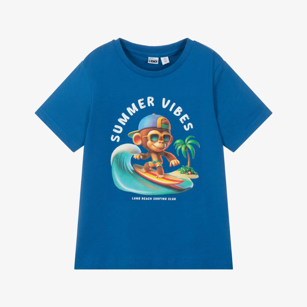 Синяя хлопковая футболка от iDO с игривым дизайном, обновляющим летний гардероб для мальчиков. Эта футболка с короткими рукавами из мягкого хлопкового трикотажа украшена ярким принтом обезьяны на серфинге, создающим атмосферу отпуска. Идеально подходит для теплых дней, прекрасно сочетается с шортами или джинсами, обеспечивая как стиль, так и комфорт для активного отдыха на свежем воздухе.
