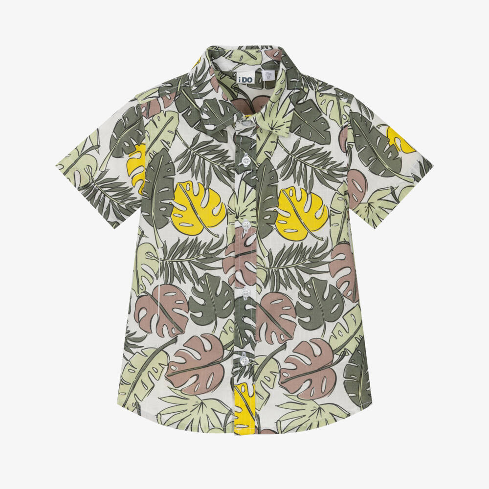A warm weather style for boys, this white, short-sleeved cotton shirt from iDO Baby is patterned with tropical leaves in shades of green, yellow and brown. It has a cool, lightweight linen feel and fastens with buttons on the front.