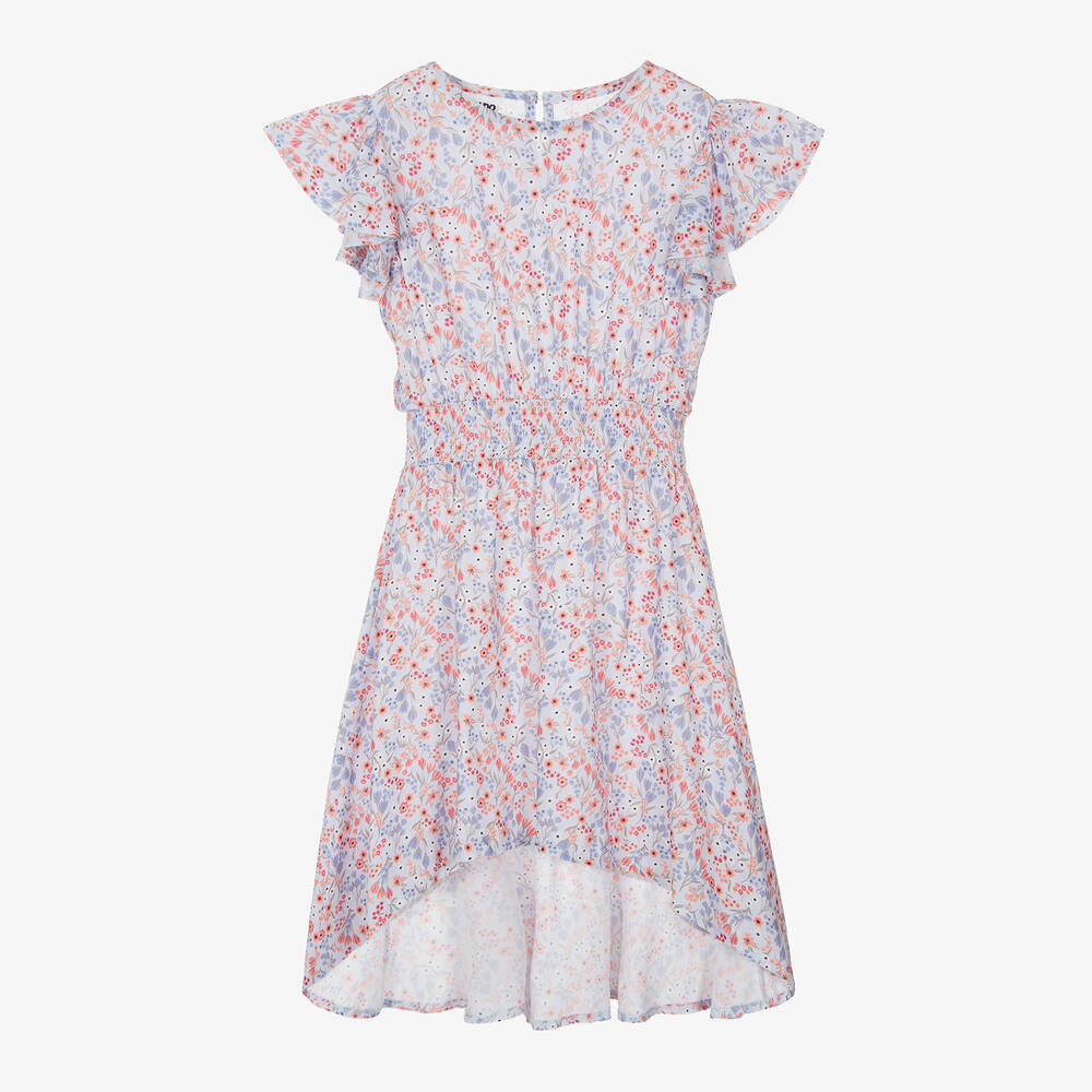 Patterned in pretty florals, this blue dress for older girls is designed by iDO Junior. Softly woven in viscose, it has a shirred waist for a feminine silhouette and stylish asymmetric hem. It simply fastens with a keyhole button on the back.