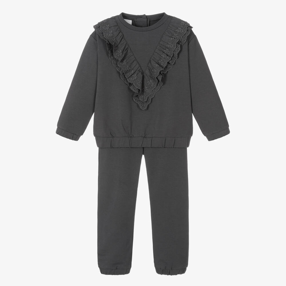 Younger girls grey tracksuit by iDO Baby, made in soft cotton lightweight sweatshirt jersey. The top has a lovely v-shaped lace frill on the front, with elasticated cuffs and hem and buttons on the back to fasten. The matching trousers have a stretchy waistband, side pockets and elasticated cuffs.