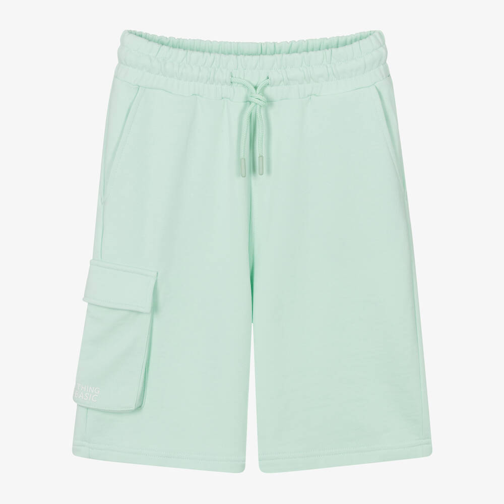 Pale green shorts for older boys and girls by iDO Junior, made in soft cotton jersey for comfortable wear. This casual style has slanted front pockets and a stretchy drawstring waistband for a great fit. There is a cargo-style pocket on one leg, featuring an 'Anything But Basic' slogan in white.