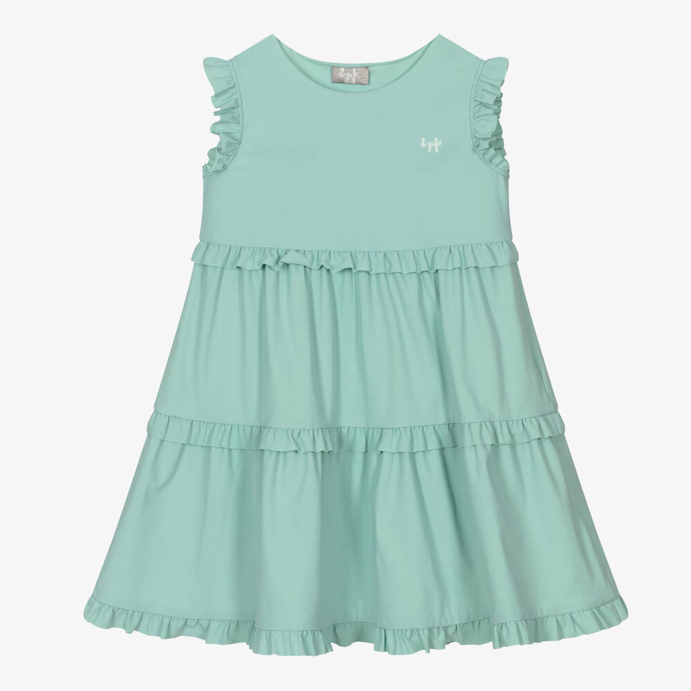 A lovely aqua green dress for girls by luxury Italian brand Il Gufo. This sleeveless lightweight dress has pretty ruffle trims around the arms and on the skirt for a tiered look. It is made in super soft and silky jersey with raw edges and has the designer's logo printed on the chest in white.
