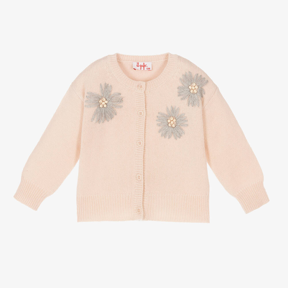 Pale pink cardigan for girls by luxury Italian brand Il Gufo, knitted in soft virgin Merino wool. It has ribbed trims and pretty hand-stitched floral motifs, with wooden beads in the centre. With a round neck, it fastens with logo branded buttons on the front.