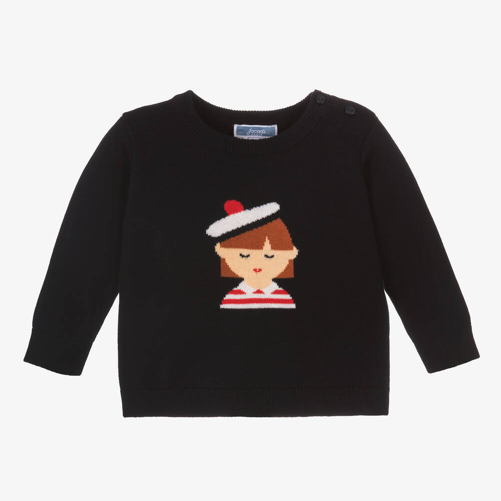 Lovely navy blue sweater for little girls by traditional French brand Jacadi Paris. It has an intarsia French girl on the front, wearing a beret and Breton striped top in red and white. Knitted in comfortable organic cotton, it is easy to wear, with logo buttons on one shoulder.