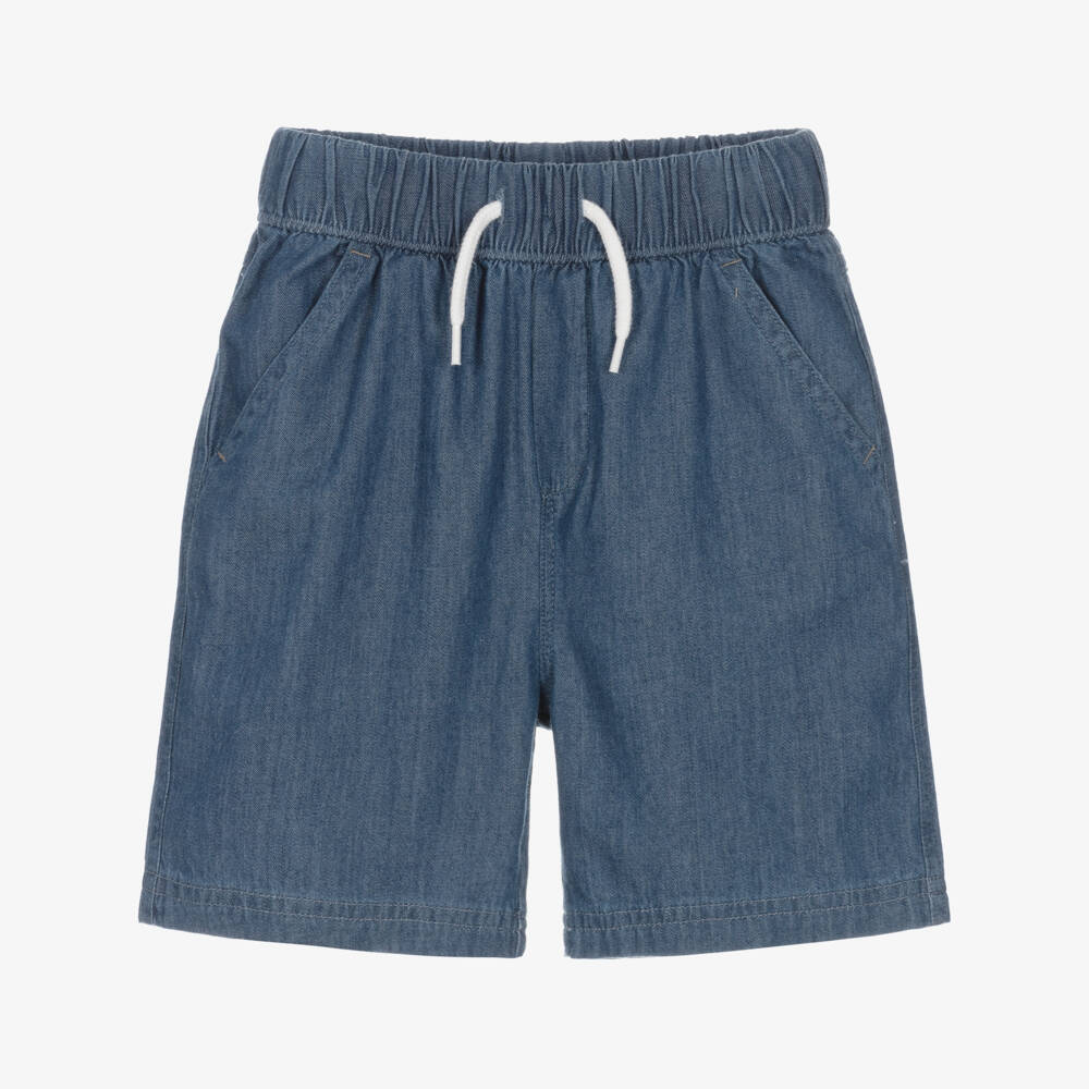 Casual blue cotton shorts for boys by British brand Joyday, exclusive to Childrensalon. Made in lightweight chambray for warm days, they have an elasticated waistband for a comfortable fit and a faux drawstring. There are useful, slanted side pockets and a further patch pocket on the back with a flap.