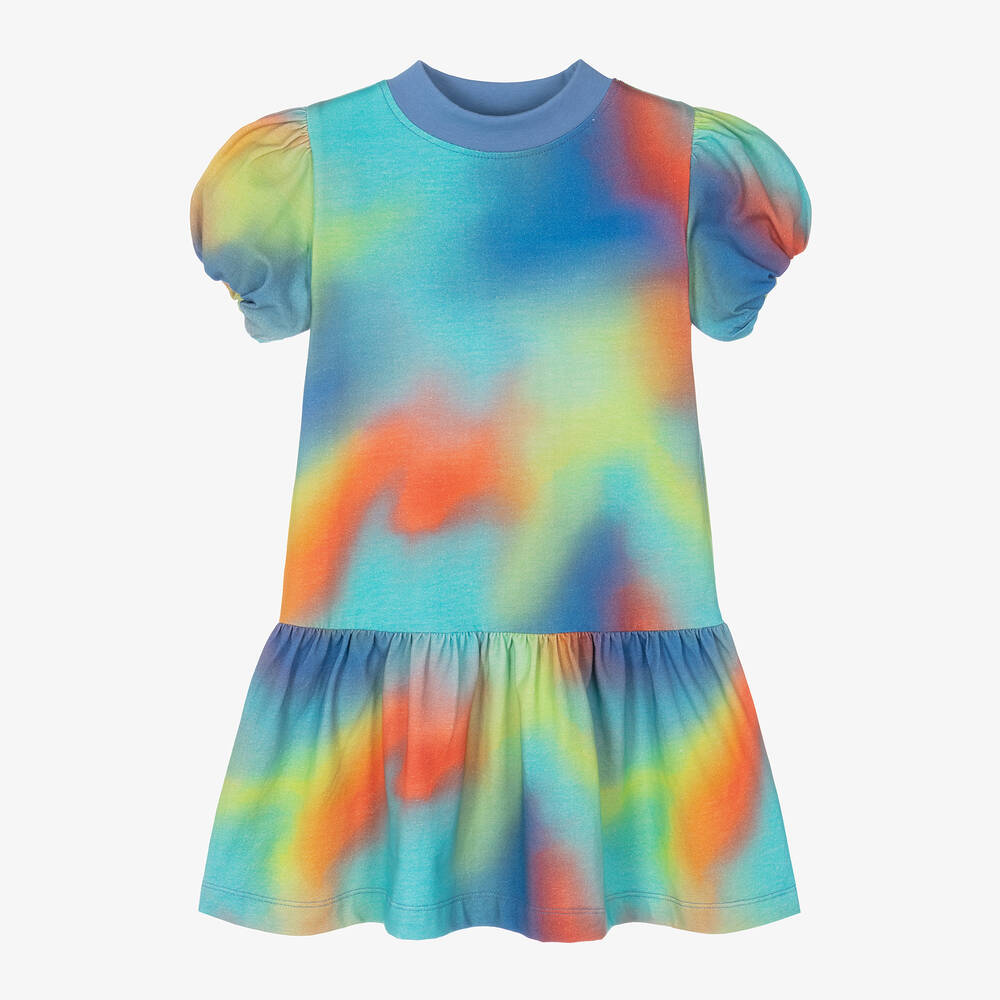 Colourful cotton dress for girls by British brand Joyday, exclusive to Childrensalon. Both casual and eye-catching, it is made in comfortable jersey with a spray paint effect in blue, orange, green and blue. The dress has a ribbed collar, pretty puffed sleeves with gently elasticated cuffs, and a dropped waist with a gathered skirt below. Easy to wear, it slips on over the head.