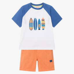 Super sweet cotton shorts set for little girls by British brand Joyday, exclusive to Childrensalon. The blue chambray top has a colourful sunshine print on one side, with pink shoulder straps. It is frilled and elasticated around the top for a good fit. The bright pink jersey shorts have a comfortable, frilled, elasticated waistband and gently elasticated cuffs.
