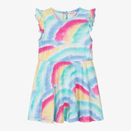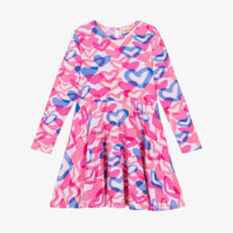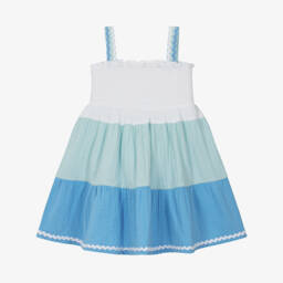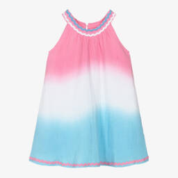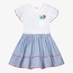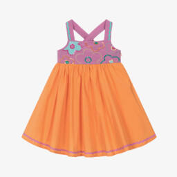 Both colourful and fun, this purple and fuchsia pink cotton dress for girls is by British brand Joyday. Exclusive to Childrensalon, it is lovely for casual wear and special occasions alike. Made in lightweight, comfortable poplin, it has a square-necked, purple bodice and pretty, puffed sleeves with gently elasticated cuffs. The full, gathered, fuchsia pink skirt has a delicate tulle overlay and a frilled ruffle around the hem. It fastens with purple buttons around the back and is fully lined for comfort.