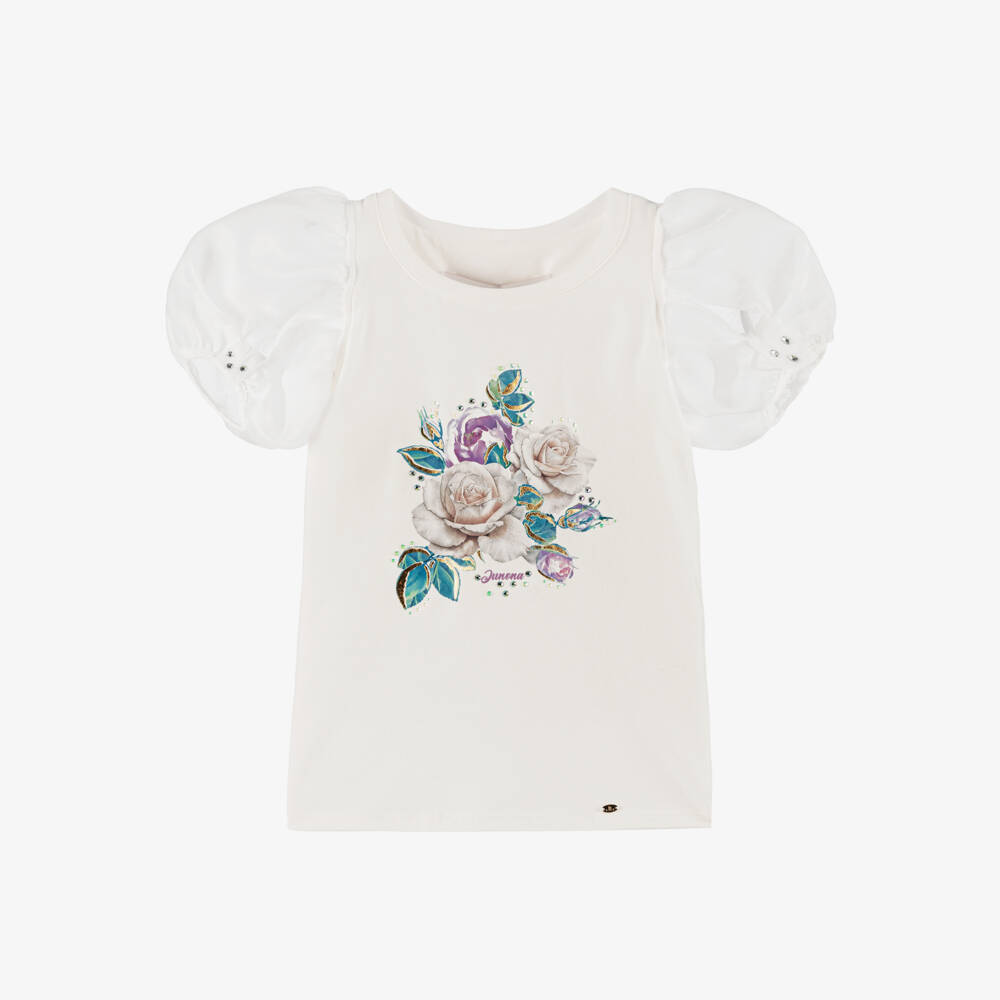 Pretty white T-shirt for girls by Junona, made in soft cotton jersey. The oversized organza short sleeves are puffed, with an open effect and pretty pink diamantés for an eye-catching look. The front has a charming ivory, purple and blue floral print with gold foil details and diamantés for added sparkle.