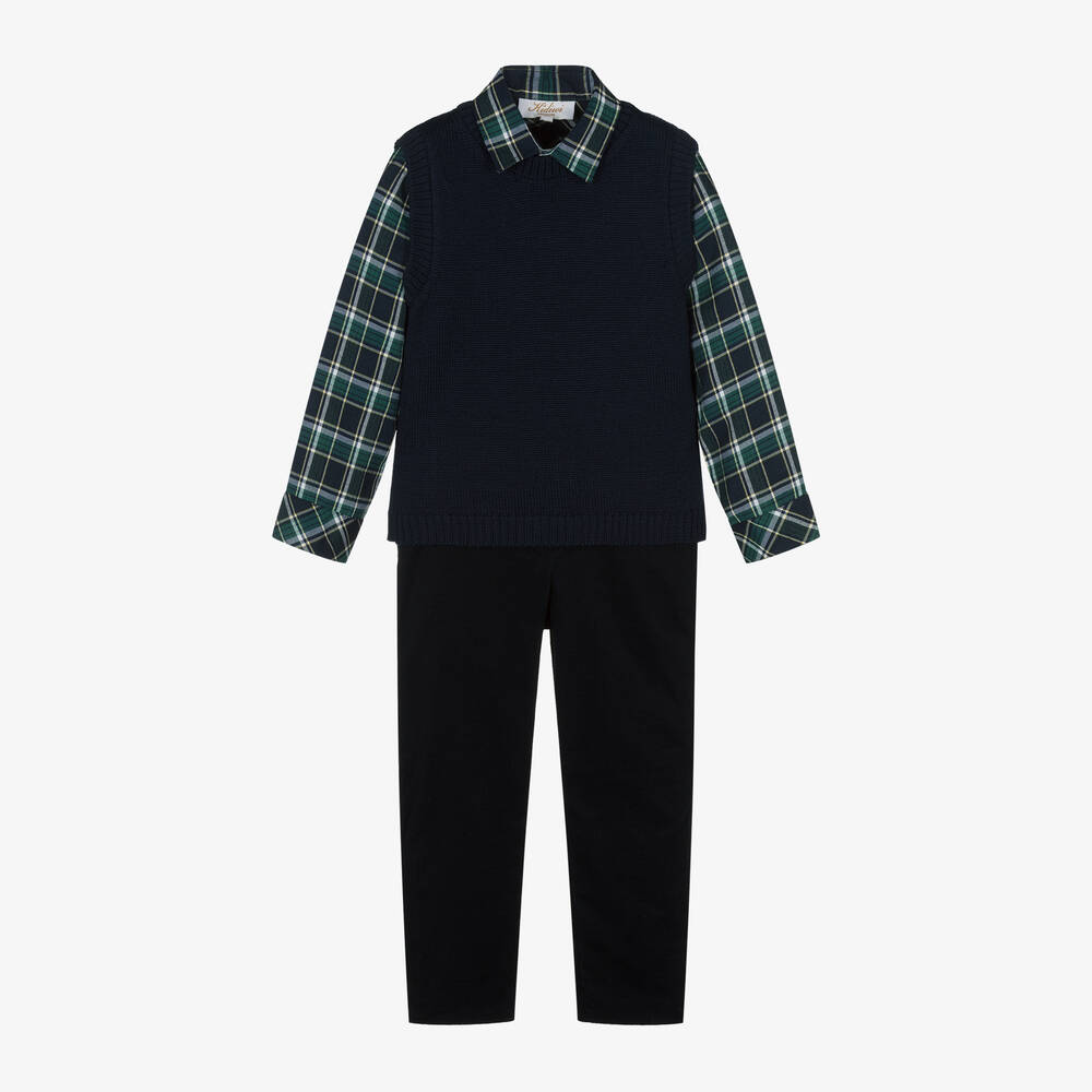 A charming navy blue trouser set for boys, handmade by Kidiwi. Made in soft needlecord, the smart trousers have slanted front pockets, a slip pocket on the back and detachable shoulder straps. They fasten with a concealed button and zip and have an adjustable waistband for a comfortable fit. In a blue and green tartan check, the long-sleeved shirt has a pointed collar and neat button fastenings. A navy blue slipover, knitted in extra fine Merino wool, completes the classic look.