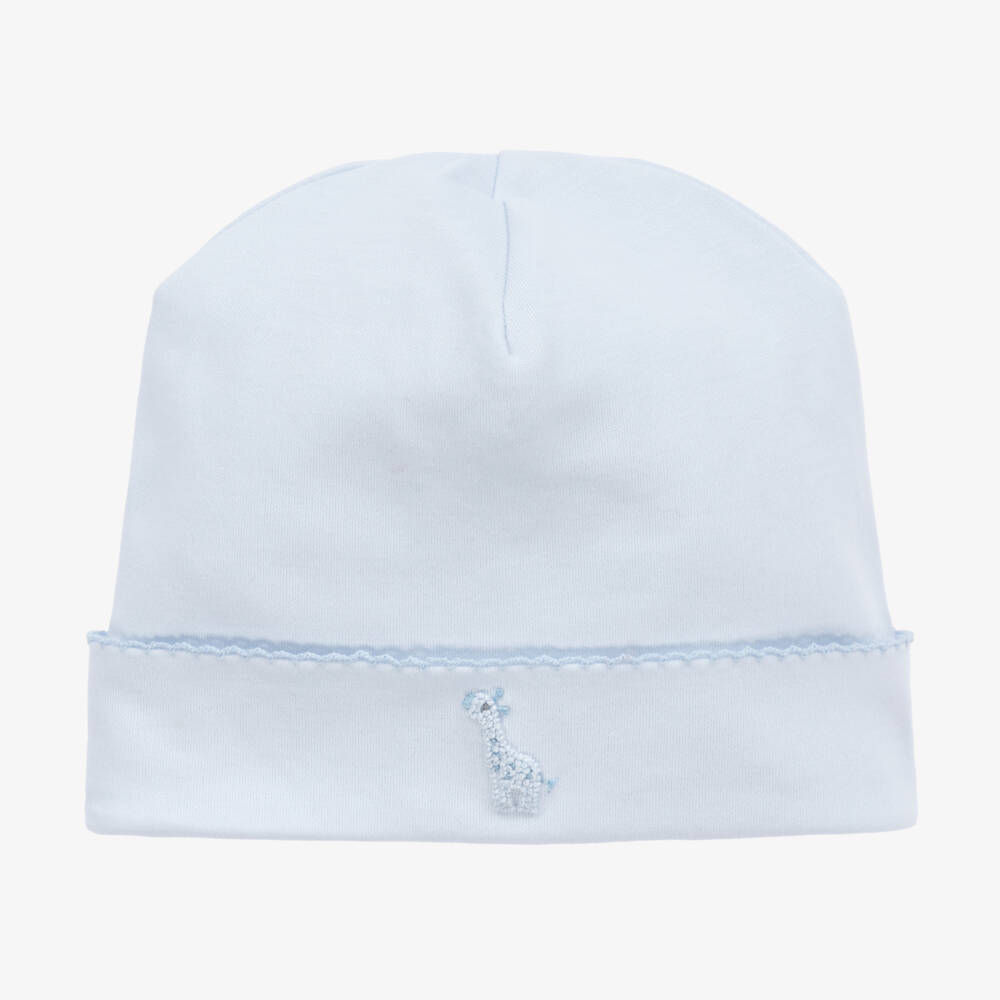 Cute blue layette hat for baby boys by Kissy Kissy, made in beautifully soft Pima cotton jersey. Lovely for keeping your little one's head warm, it has a turned-up brim with a sweet, hand-embroidered giraffe.