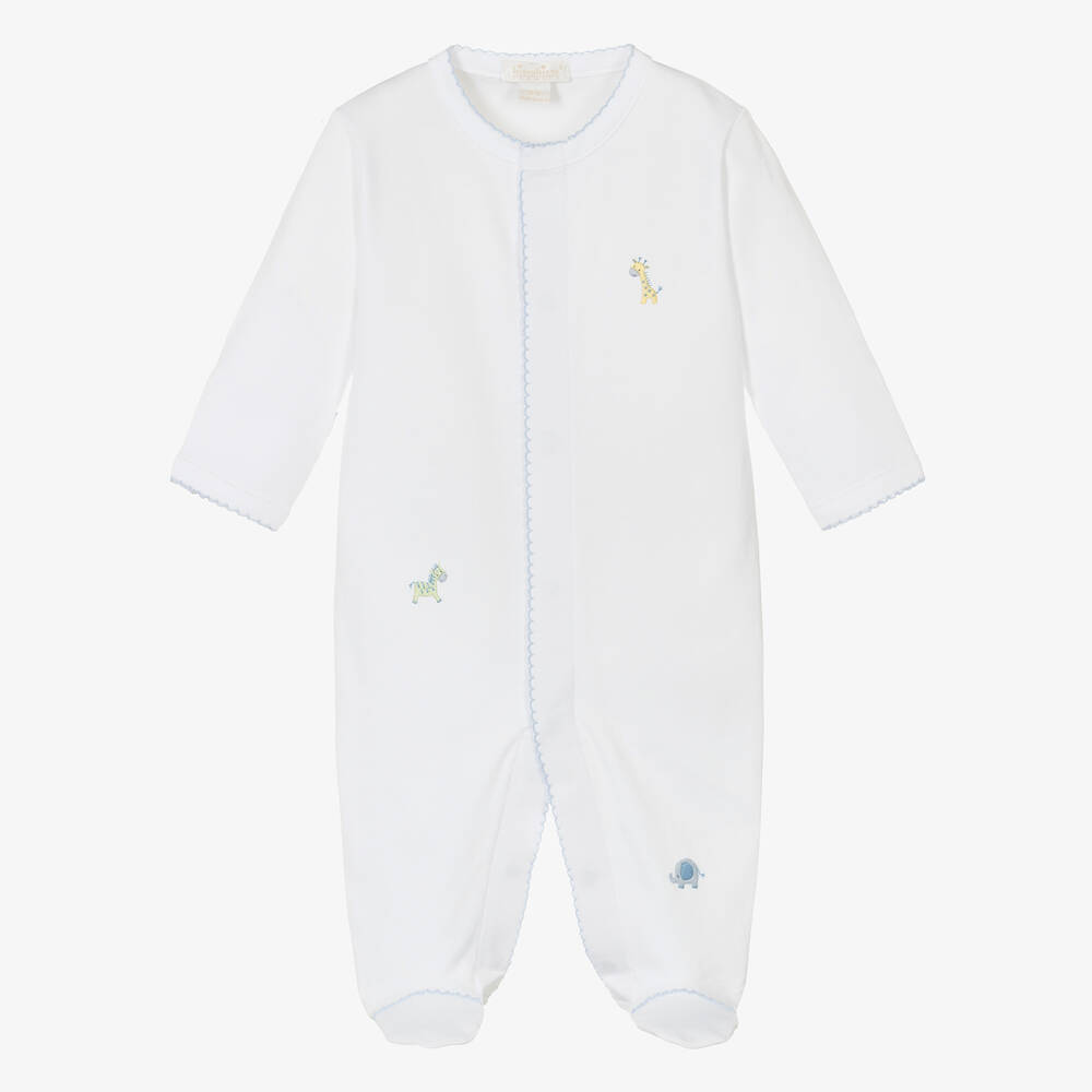 A white babygrow for boys by Kissy Kissy, made from soft Pima cotton jersey. Absolutely adorable, it has hand-embroidered jungle animals scattered across the front and subtle pale blue scalloped trims. Simple in style, it fastens with concealed poppers down the centre and between the legs, and has fold-over scratch mitts on smaller sizes.