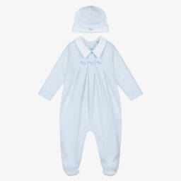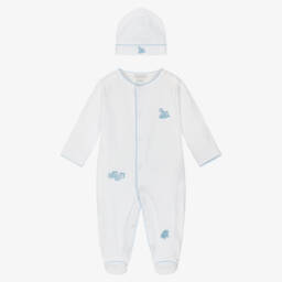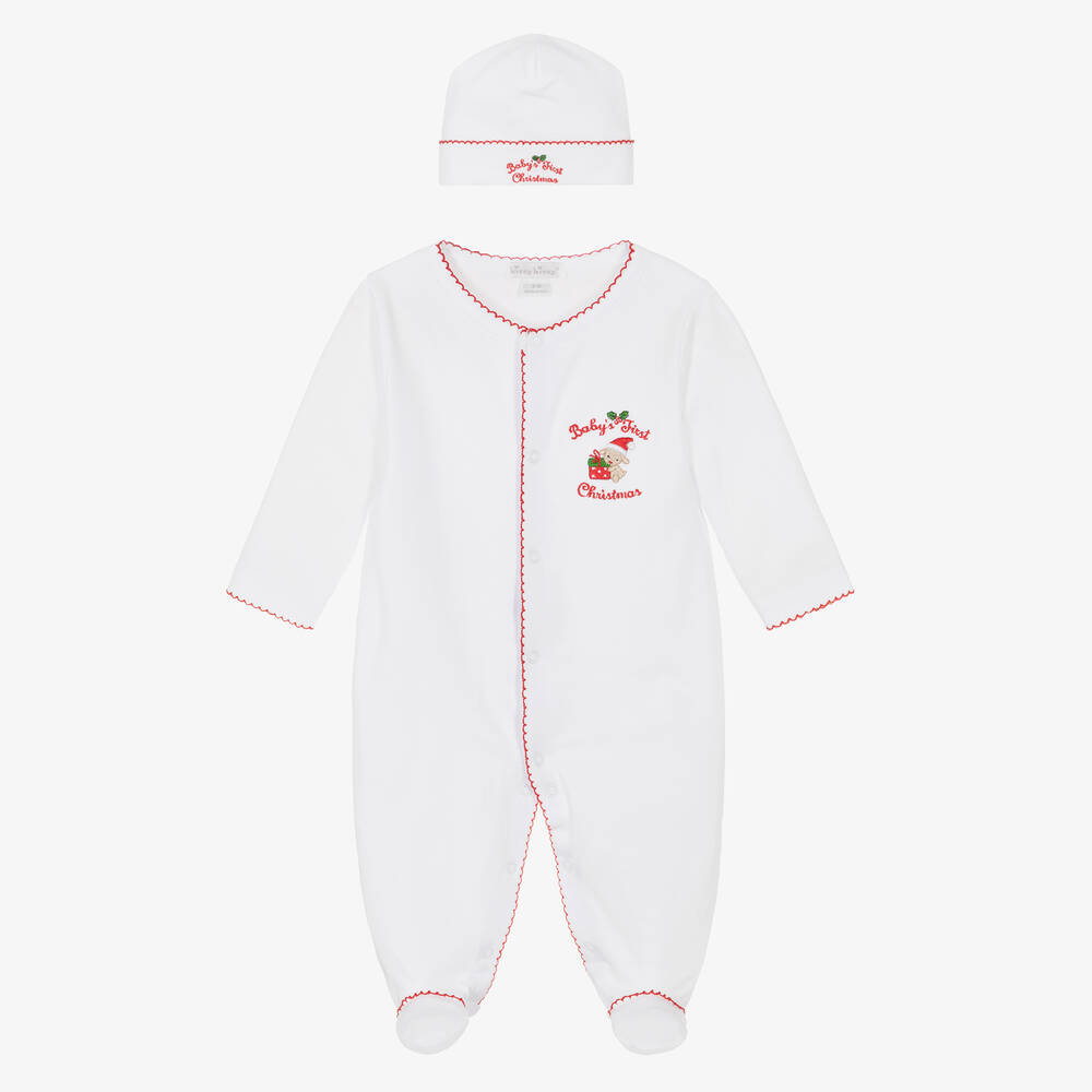 White babysuit set for little boys and girls by Kissy Kissy, lovely for their first Christmas. Made in beautifully soft and gentle Pima cotton jersey, this festive babygrow has a sweet 'Baby's First Christmas' embroidery on the chest and a delicate red picot trim. It fastens with poppers on the front and between the legs to help with easy dressing. A coordinating layette hat completes the adorable look, ideal for Christmas day.