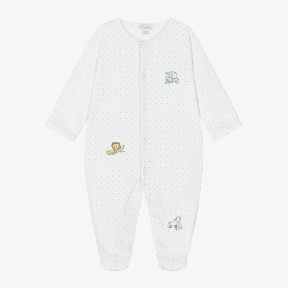 White babygrow for boys and girls by Kissy Kissy, made in super soft Pima cotton jersey. It is patterned in pale grey dots, with sweet hand-embroidered jungle animals on the front. There are poppers for easy fastening and protective fold-over scratch mitts on the smaller sizes.