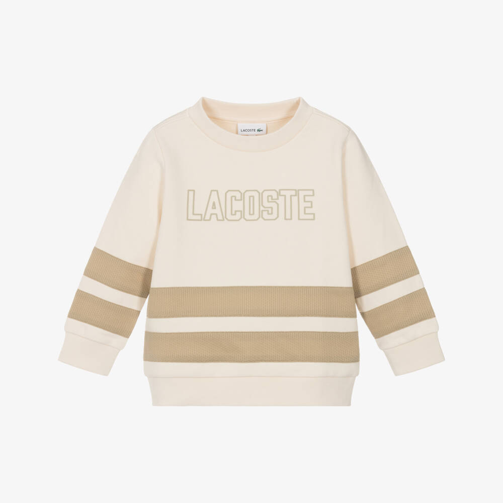 Boys ivory organic cotton sweatshirt by Lacoste, with stripes of slightly textured beige fabric around the cuffs and hemline. Made in soft jersey, it has a bold, rubberised logo across the chest for instant brand appeal, as well as the signature crocodile logo badge embroidered in green around the back. Ideal for everyday wear, this sweatshirt combines designer style and comfort, whether at play or relaxing at home.