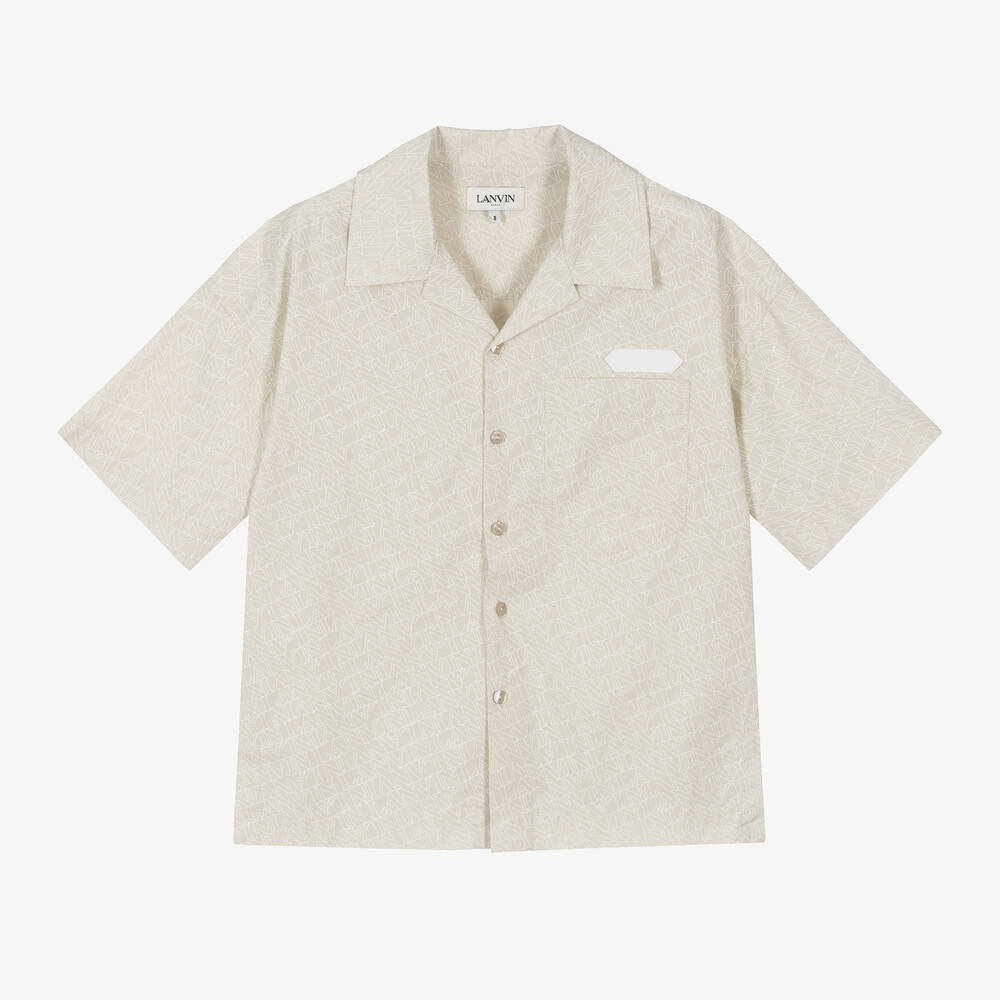 A light beige shirt for boys by luxury brand Lanvin, made in lightweight cotton poplin with ivory logo branding. It has a split hem and an open collar for a more relaxed look. There is a rubberised Lanvin label stitched above the chest pocket, taken from the House's archives.