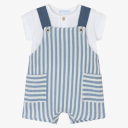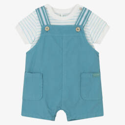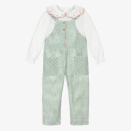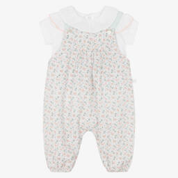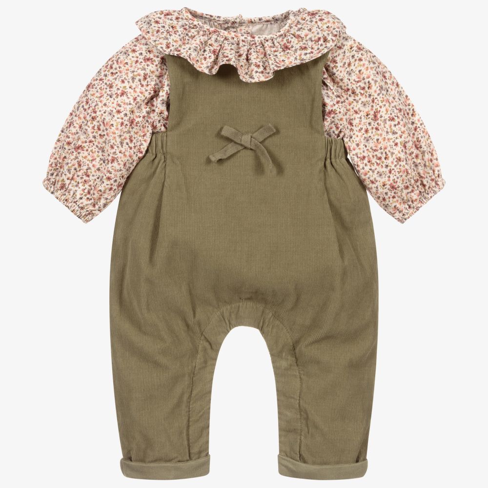 Cute dungaree set for baby girls by Laranjinha. The ivory blouse has a pink and green floral print with a ruffled neckline and gently elasticated cuffs. The green needlepoint corduroy dungarees have elasticated sides, with a bow on the front and fixed turn-ups.