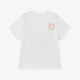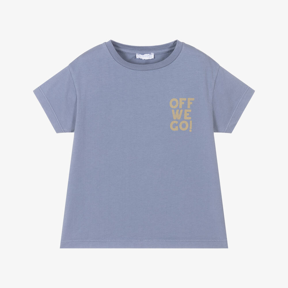 A cotton T-shirt for boys by Laranjinha, in a cool shade of pale indigo blue. This casual top has 'Off we go' printed on the chest and an outdoor-inspired graphic on the back.